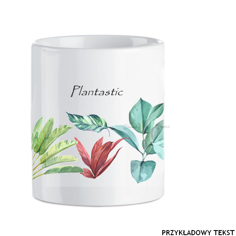 Biały kubek ceramiczny z piękną grafiką ozdobnych roślin domowych. Coś dla tych, którzy lubią otaczać się roślinami i cenią sobie walory natury. Kubek może również zmienić zastosowanie i stać się przybornikiem lub dekoracyjną osłonką na niewielką doniczkę.