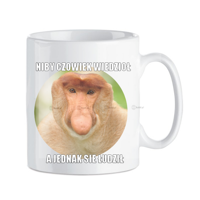 Klasyczny, biały kubek z motywem Nosacza Sundajskiego, dobrze znanego w szerokim gronie.