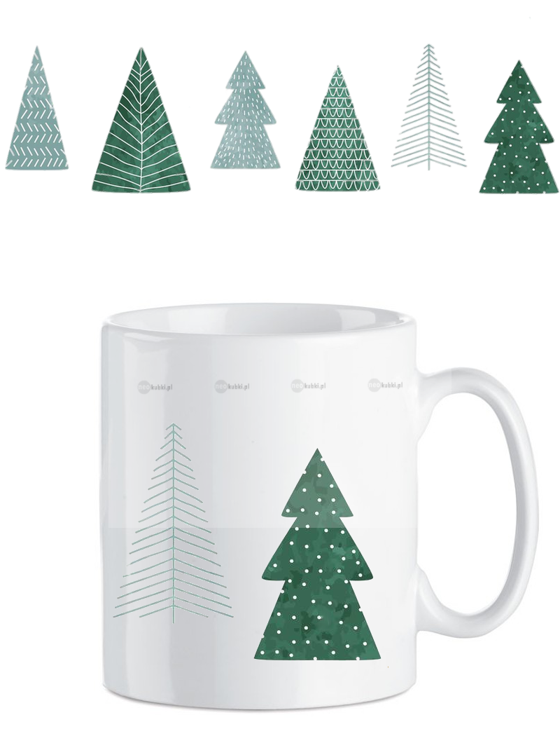 Biały kubek ceramiczny z prostą grafiką świątecznych drzewek.